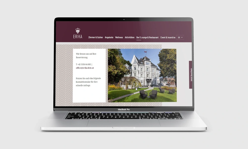 Das 1897 im Jugendstil erbaute Hotel wird von einem zauberhaften Garten mit Naturteich und altem Baumbestand umschlossen. Auch die Schneeheide, Erika genannt, wächst hier und ist Ursprung der Logoentwicklung. Die filigrane Abstraktion eines Blütenkelch-Querschnitts wird zum Icon und ist im wahrsten Sinne die Krönung der Wort-Bildmarke.